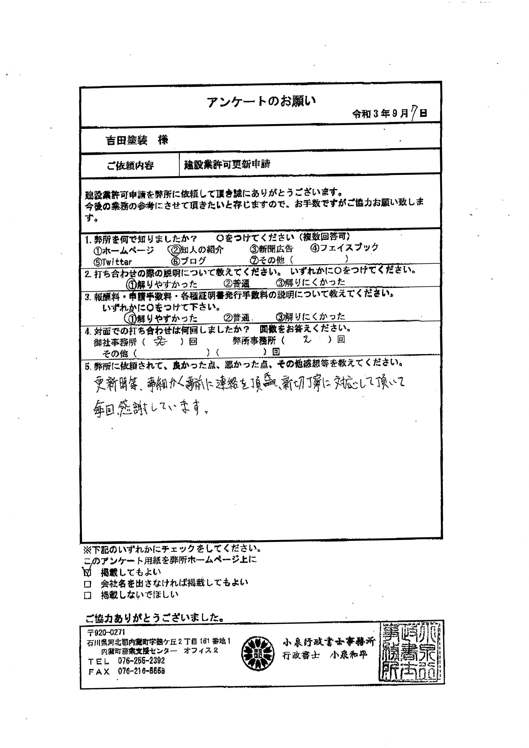 小泉行政書士事務所 > お客様の声 > 塗装工事業者様 > アンケート